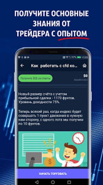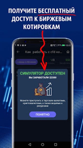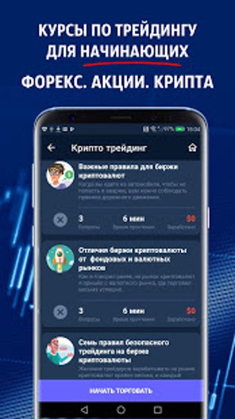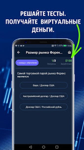 Приложение разработано для обучения вам торговле на Форекс, чтению финансовых новостей и деланию предположений при анализе рынка. Оно охватывает такие темы, как валютный рынок, различные торговые платформы, тонкости торговли нефтью, ценными бумагами и металлами, и многое другое. Самая увлекательная часть приложения - это викторины, где вы можете заработать виртуальные деньги за каждый правильный ответ.